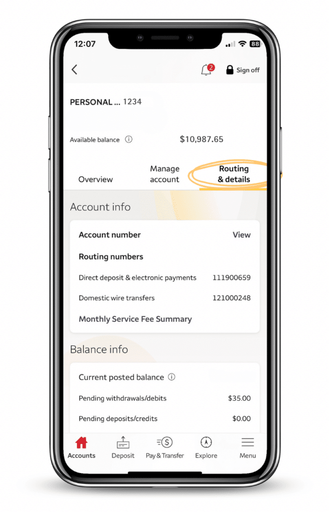You can find the routing number by clicking the “Routing number” link located next to your account number under the account name or at the bottom of the summary. The numbers you need will pop up.
